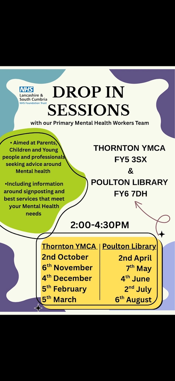 Please see below for dates & times of drop-in sessions with NHS's primary mental health team !!