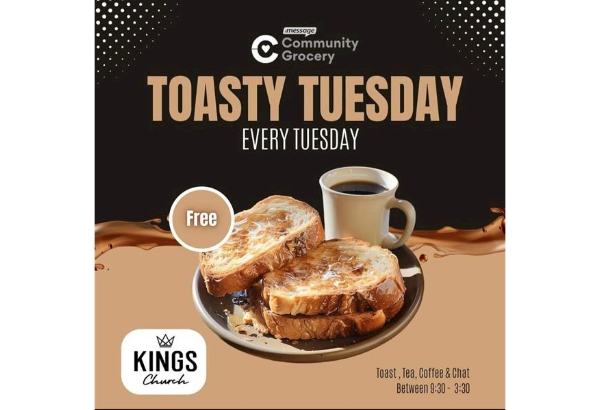 Come down to the Community Grocery next door to Kings Church on a Tuesday to enjoy free tea/coffee and toast. This is on every Tuesday between 9.30am and 3.30pm
