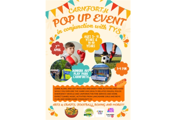 We are attending a pop up event on Tuesday 7th April from 1-4pm. Come along and get involved and enjoy free activities and food. We will be there in attendance with The HARRI VAN (Health related issues) and other emergency services. Expect games, music , activities from Lancashire girls and boys club and Morecambe Community FC.